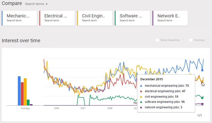 As an engineering and IT recruiting firm, we wanted to see which engineering job types were getting the most Google searches over-time heading into 2016. We analyzed a lot of engineering and IT job categories. For purposes of this blog post, however, we thought you might find it of interest to get at least a snippet of information from our study; so this post will comment on search trends in Google from 2004 to January 2016 for these high-level, core engineering and IT job recruitment categories:
