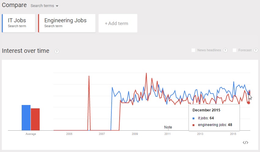 You’ll notice in this chart above that (as you might expect) Google searches for the phrase “engineering jobs” became “reportable” in Google’s data first (see the red line in mid-2005), and then high-enough volumes of searches for the phrase “IT Jobs” (relative to all Google searches for everything else) emerged about a year later – the blue line. Then they had a similar amount of searches until about 2011 when “IT Jobs” started getting more searches on Google.